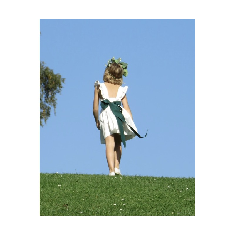 Ze werd ontworpen in een zeer mooi linnen van gebroken wit katoen, en kan gedragen worden met een smalle of brede tailleband, in de kleur van uw keuze, die geknoopt wordt op de rug. Ronde halsuitsnijding vooraan en gefronste zwierige jurk.